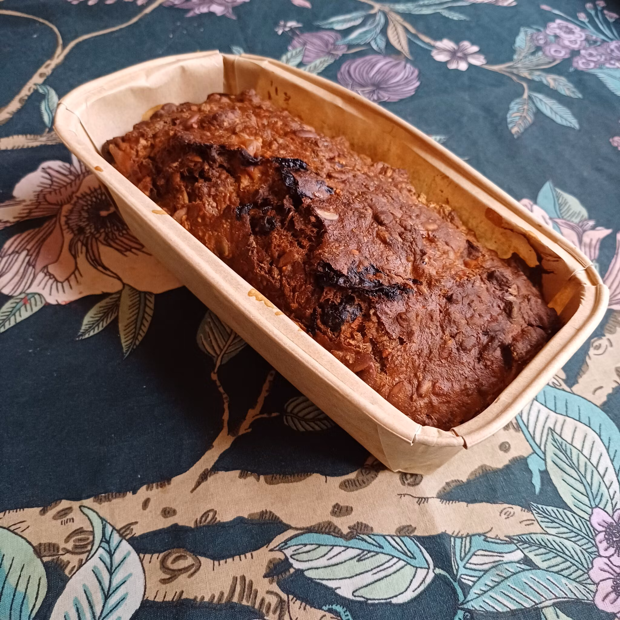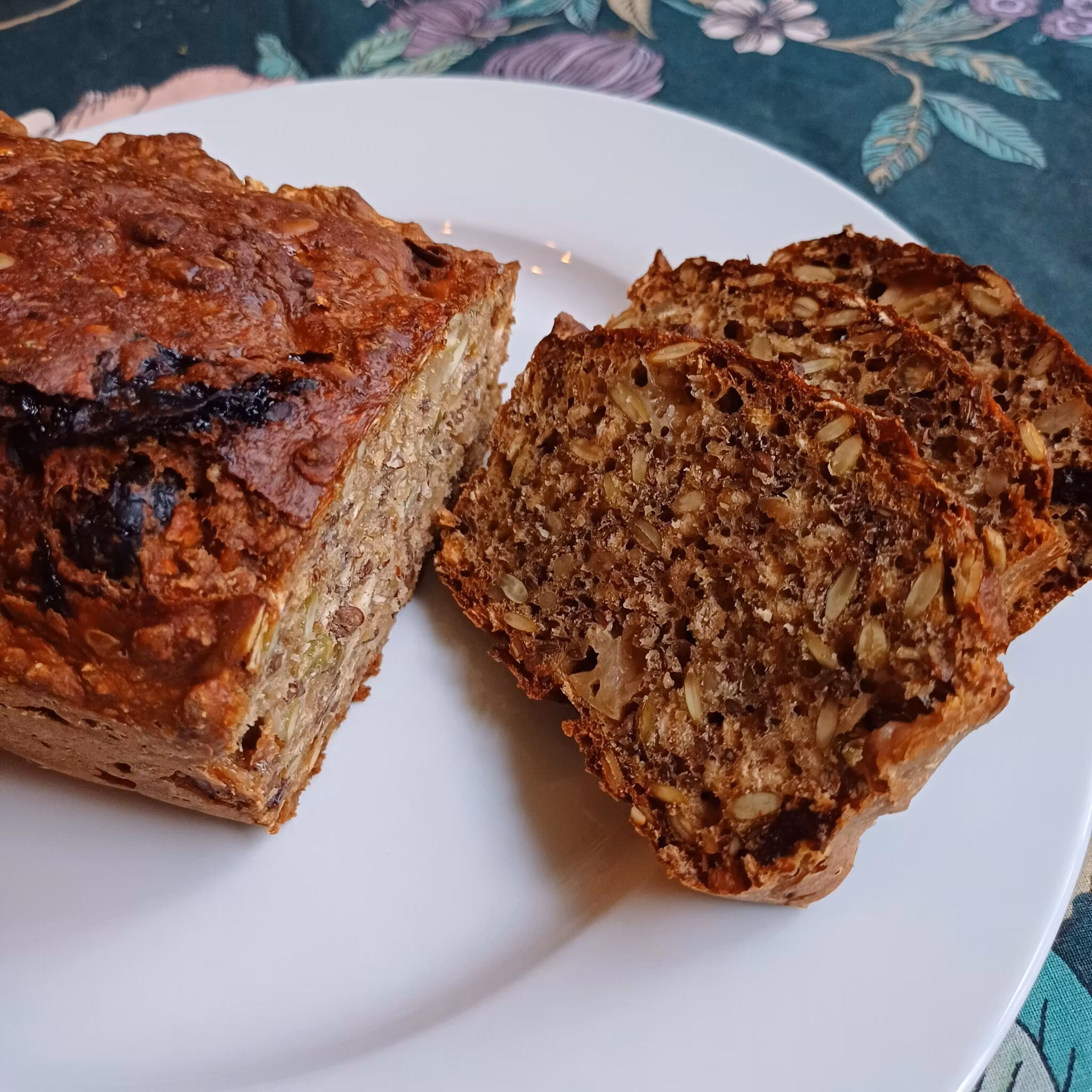Grovt bröd med solros & pumpafrön tillsammans med torkade plommon och äpplebitar.