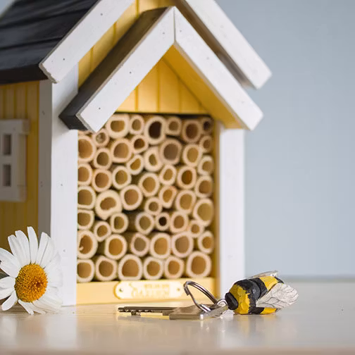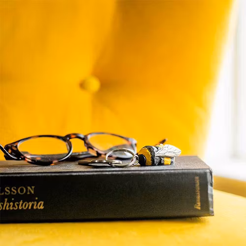 Denna humla är en nyckelring som är snidad i ett stycke trä, handmålad i miljövänlig färg och fäst i en kort kedja och nyckelring.