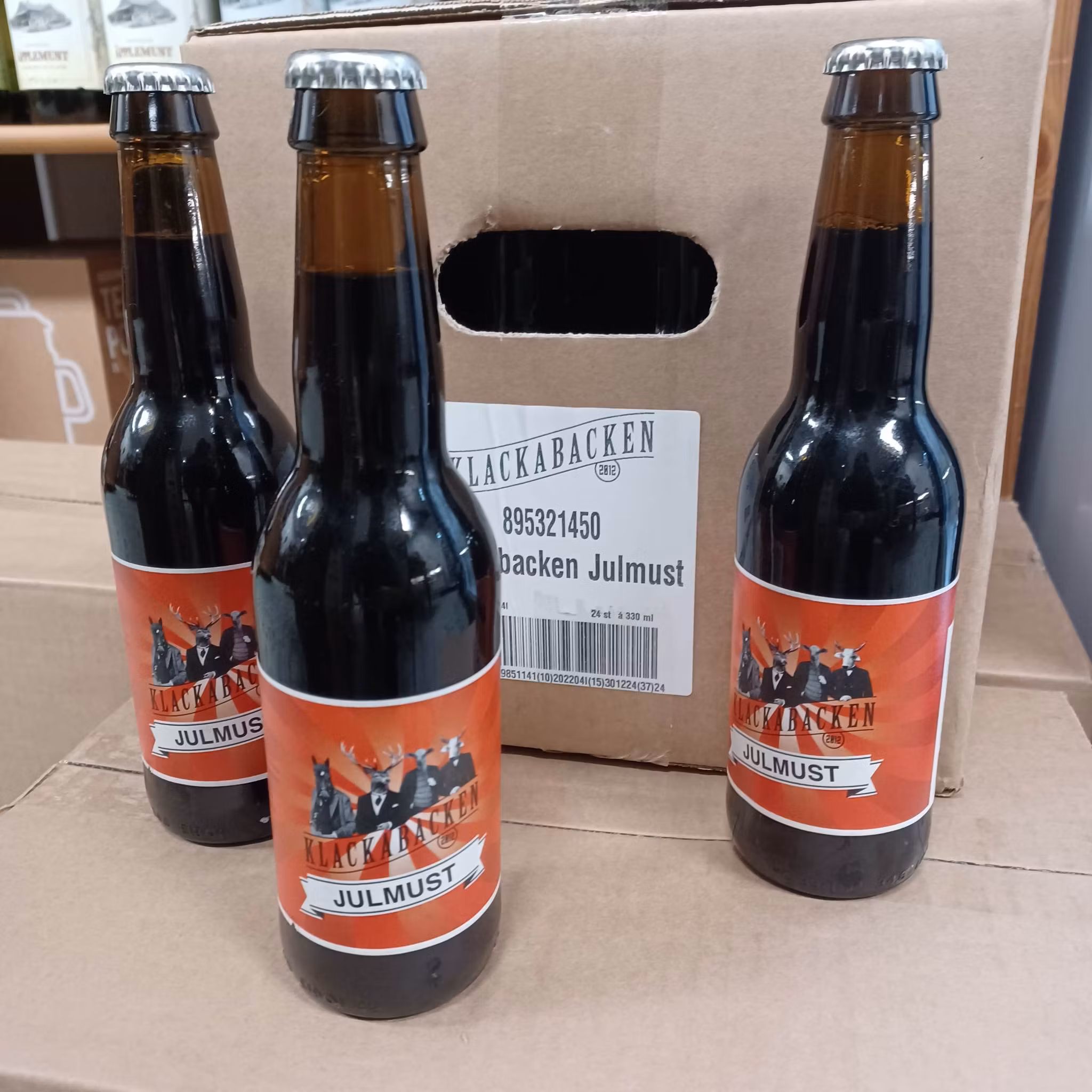 En låda innehåller 24 stycken flaskor om 33 cl julmust, från Klackabackens Bryggeri i Önnestad, utanför Kristianstad.