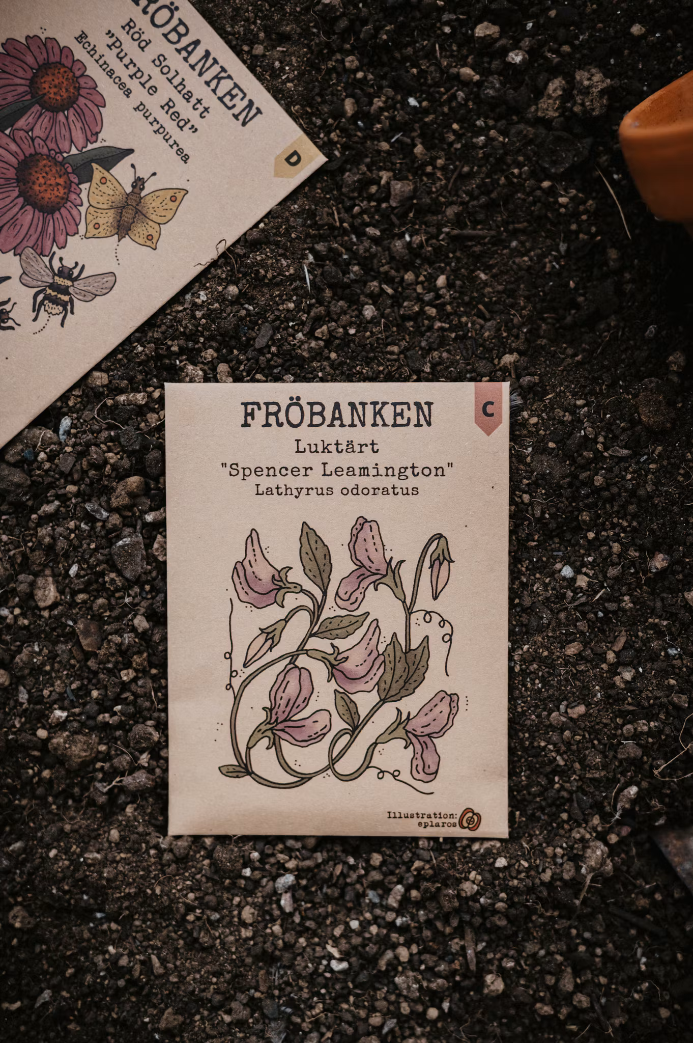 Varje fröpåse har specifika odlingsråd och beskrivning på baksidan.