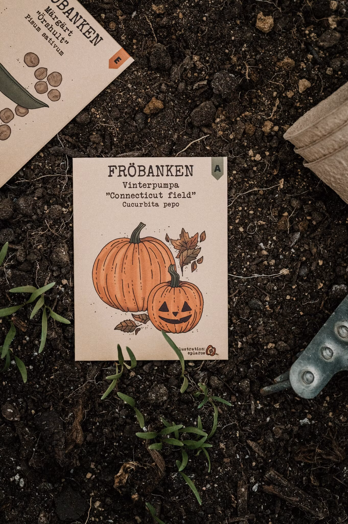 Frö till den traditionella amerikanska halloween-pumpan Connecticut Field som ger orangefärgade vinterpumpor som skördas vid 5-15 kg. Denna sort har ett lättarbetat skal som passar utmärkt för att skära ut detaljerade mönster i. Smaken är utmärkt och denna sort passar bra för matlagning, pumpapajer, bakning och desserter.