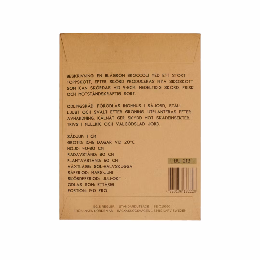Förodlas inomhus i såjord i mars-maj. Låt stå vid ca 20 grader, ställ ljust och svalare efter groning. Utplanteras efter avhärdning. Trivs bäst i mullrik och gödslad jord. Fiberduk som skydd mot skadeinsekter. Broccoli har ett svagare rotsystem än andra kålväxter och får därför inte utsättas för torka. Den trivs även i lätt jord.